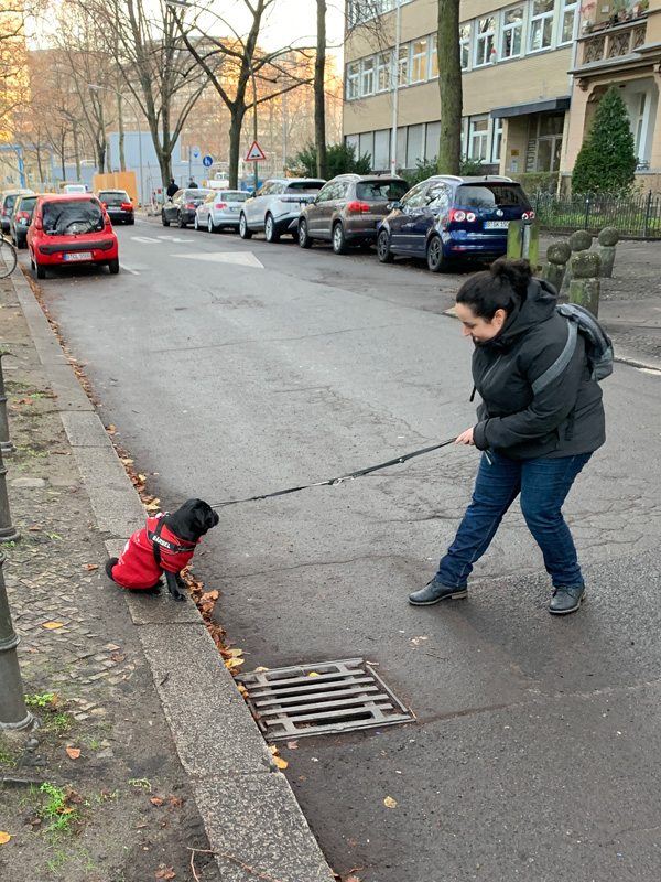 Trainingsziel: Sicheres Überqueren der Straße und Aufbau einer „Blockade“, den Bürgersteig nicht ohne Freigabe zu überqueren.